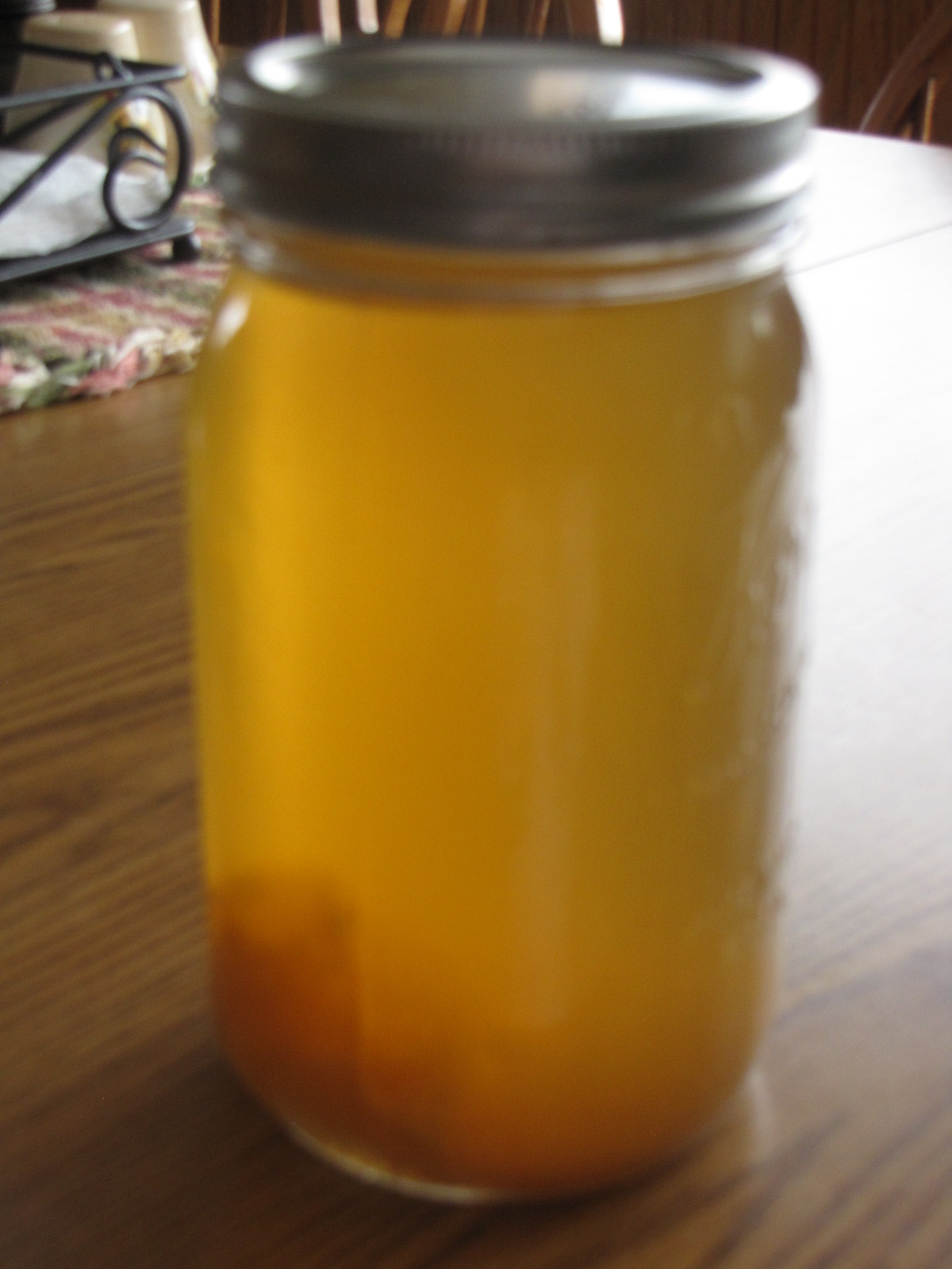 Boil the water, add the sugar until dissolved. I do mine a little different than the recipe says (I have done 4-5 quarts and it has turned out fine, at least as far as I know)…so if anyone is sitting by with your copy of NT looking at this…just know that this is my spin on it. 🙂 The recipe says to steep the tea bags in the hot water and sugar mixture. I pour the sugar water into a large glass jar that I use only for kombucha, and steep the tea bags in there. Once the water is cool, I take out the tea bags, add the 1/2 c. of kombucha and place the mushroom on top. Cover (I use a dishcloth and a rubber band) and transfer to a warm dark place. I have been keeping mine on the counter lately (my canning allows for no extra room in my pantry) and I haven’t noticed a change, although it does not get direct sunlight.  It takes about 7-10 days to brew, sometimes longer in the winter.  It will be fizzy when done.  I don’t typically see it fizzing in the jar, but when I take off the scoby and pour it into jars, it fizzes quite a bit.
