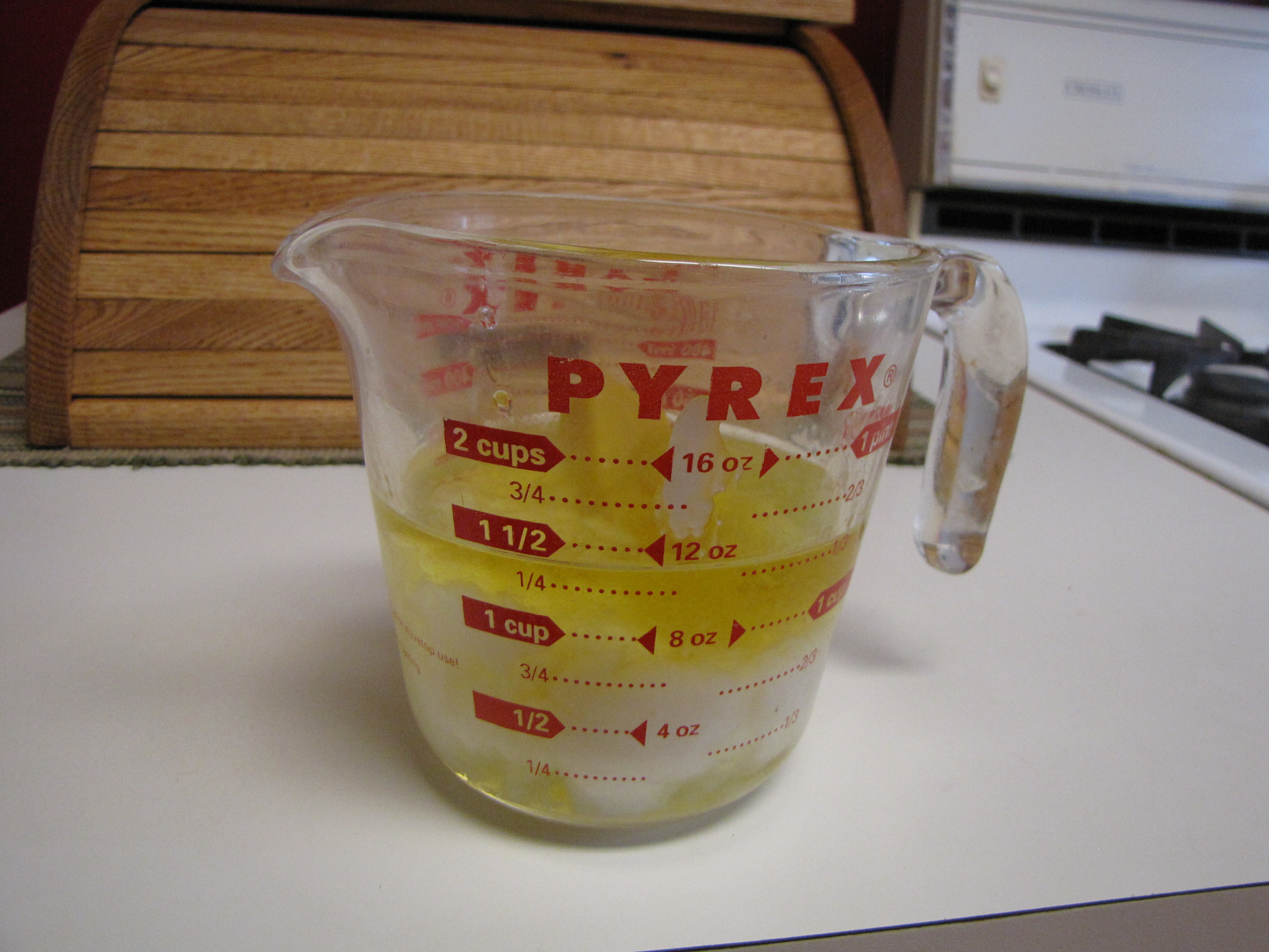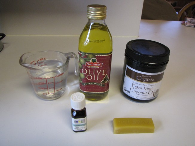 Measure and combine the oils and wax in a Pyrex liquid measuring cup. Pour in the olive oil until you reach the 6 ounce line, then add the coconut oil until the oil level rises to the 8 ounce line. Add the beeswax until the liquid reaches the 9 ounce level. Then put the cup in a sauce pan of simmering water.