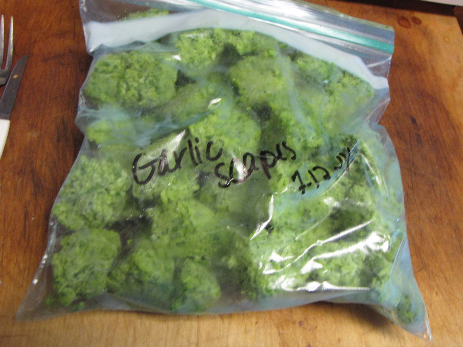 To preserve them, I stuffed the whole lot into my food processor with a little extra virgin olive oil (highly technical, I know).  I don’t have an exact amount of either, nor do I think you need one.  I added olive oil as I needed to, as they were processed in the machine.  I ended up with a thick garlic scape paste.  I put into ice cube trays, and froze.  Once they were frozen, I popped them out of the trays and stored in a large plastic bag.  This way, I can add them to soups or other dishes.  I think I’ll also try to thaw them and see if I can use in salad dressings.  Maybe they’ll be too wilty, but it’s worth a try.